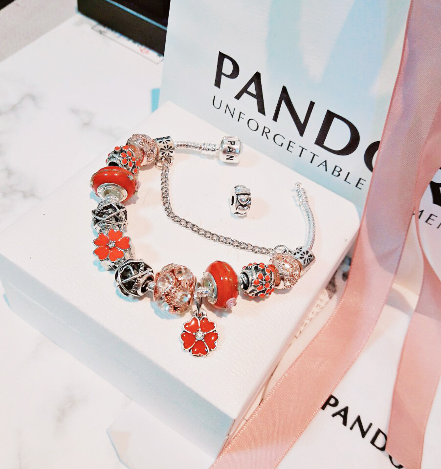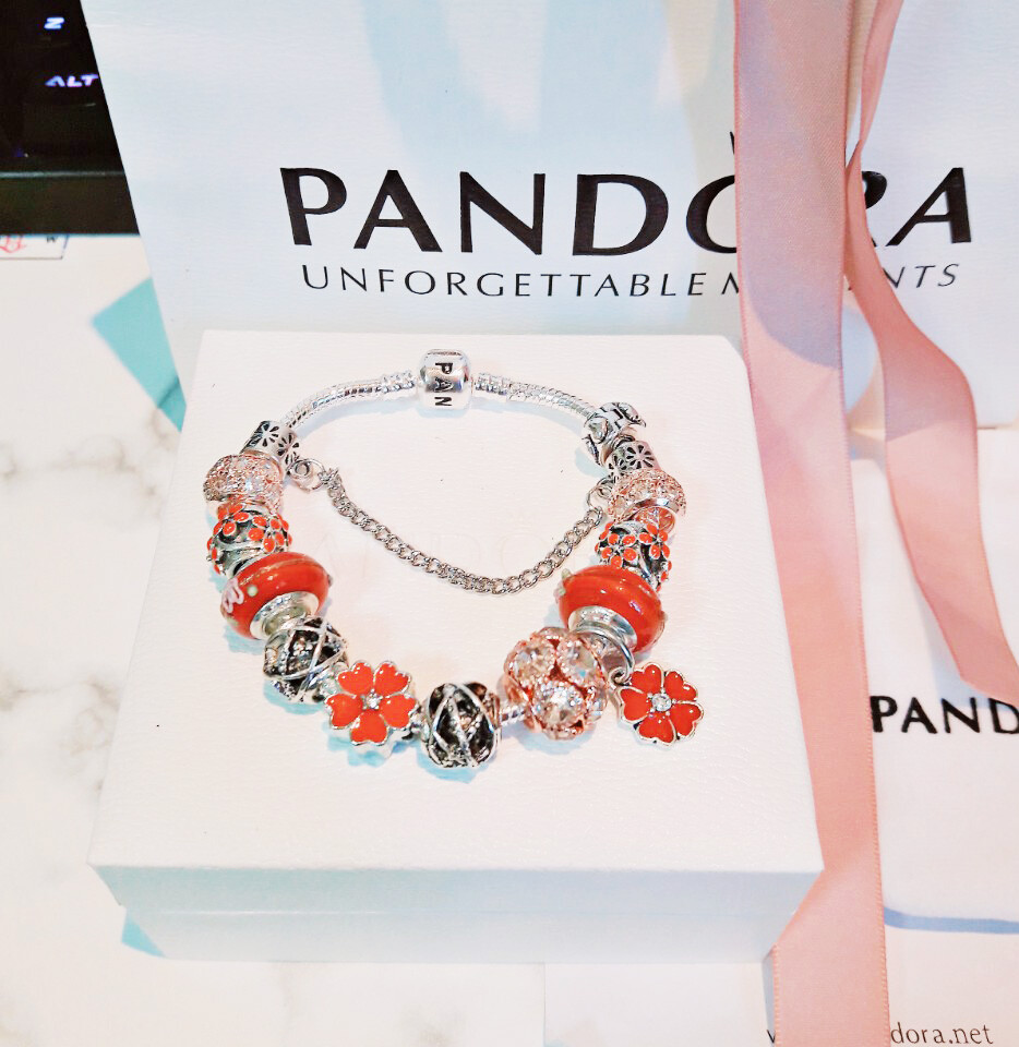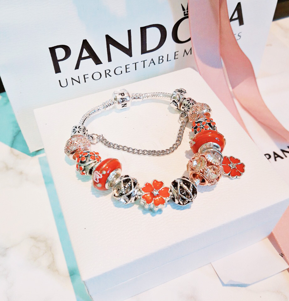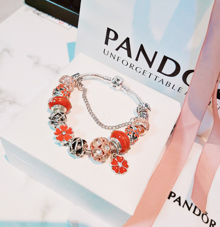 □P.ANDORA 레드 비즈 플라워 참팔찌□