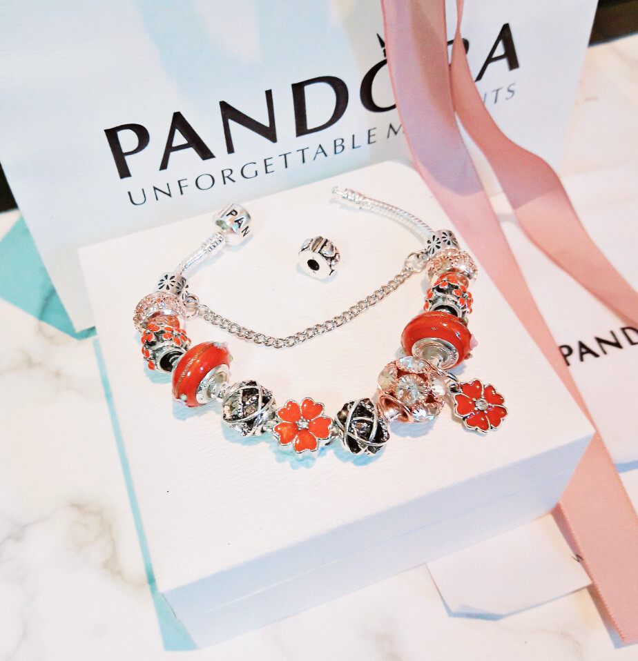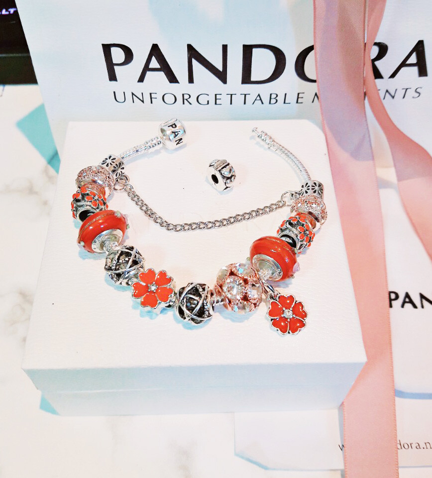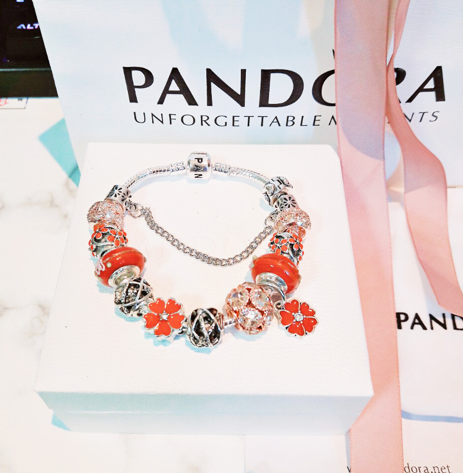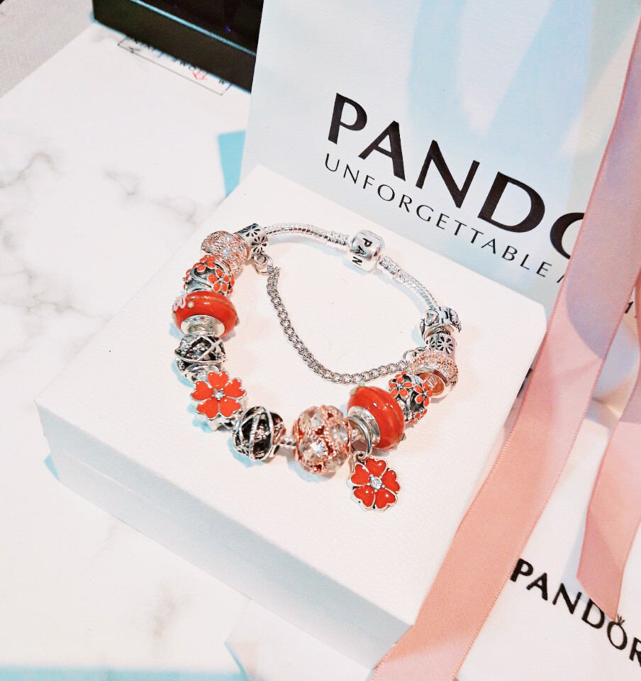 □P.ANDORA 레드 비즈 플라워 참팔찌□