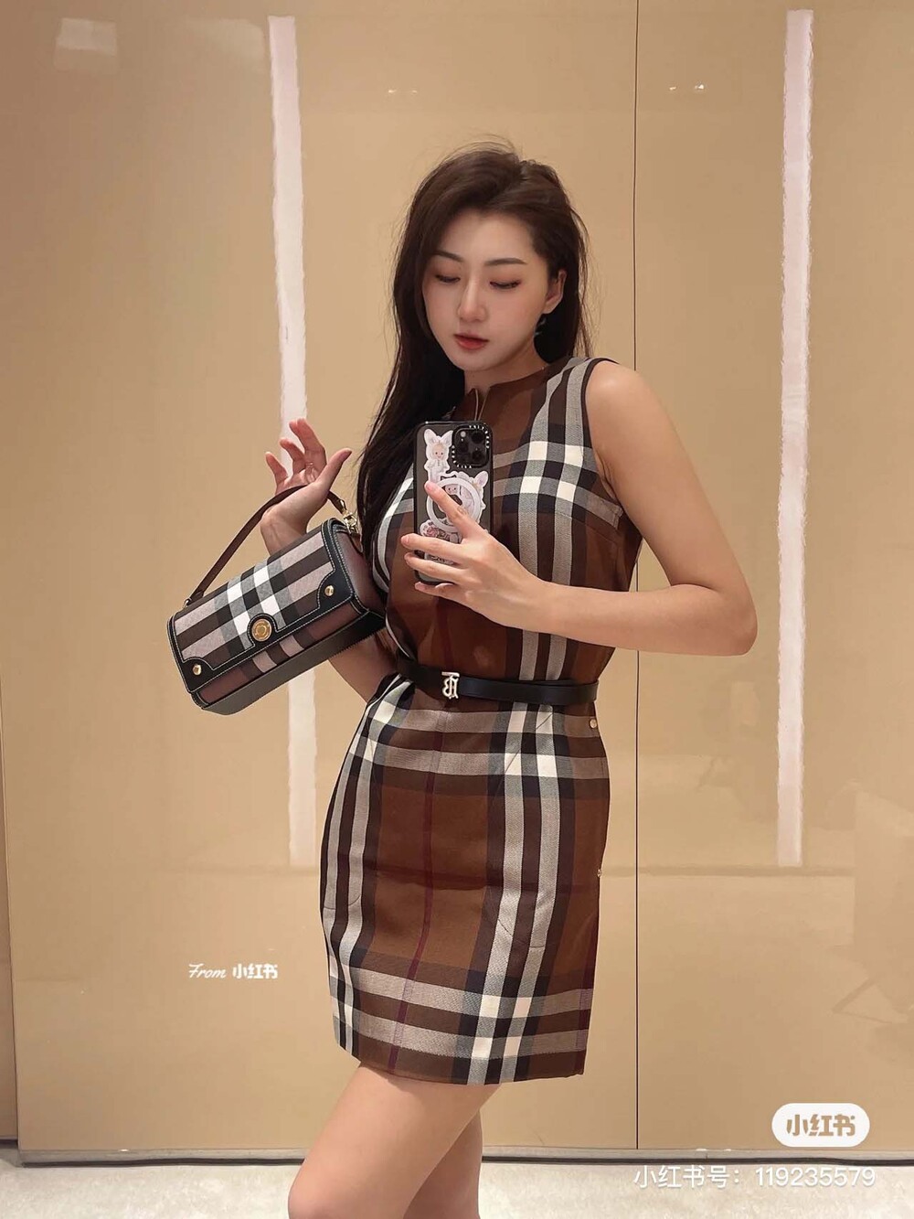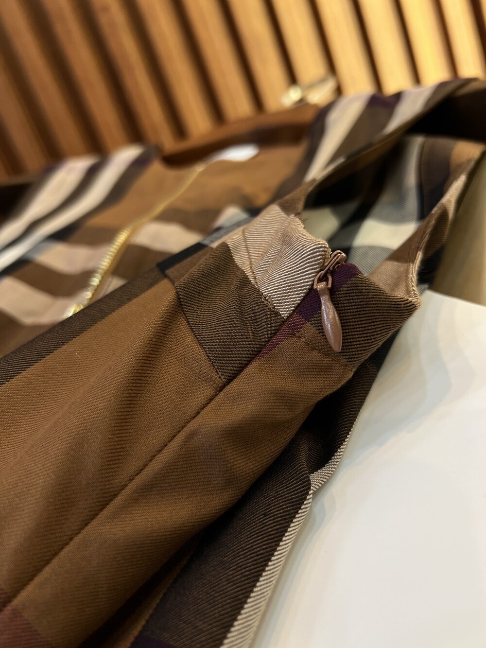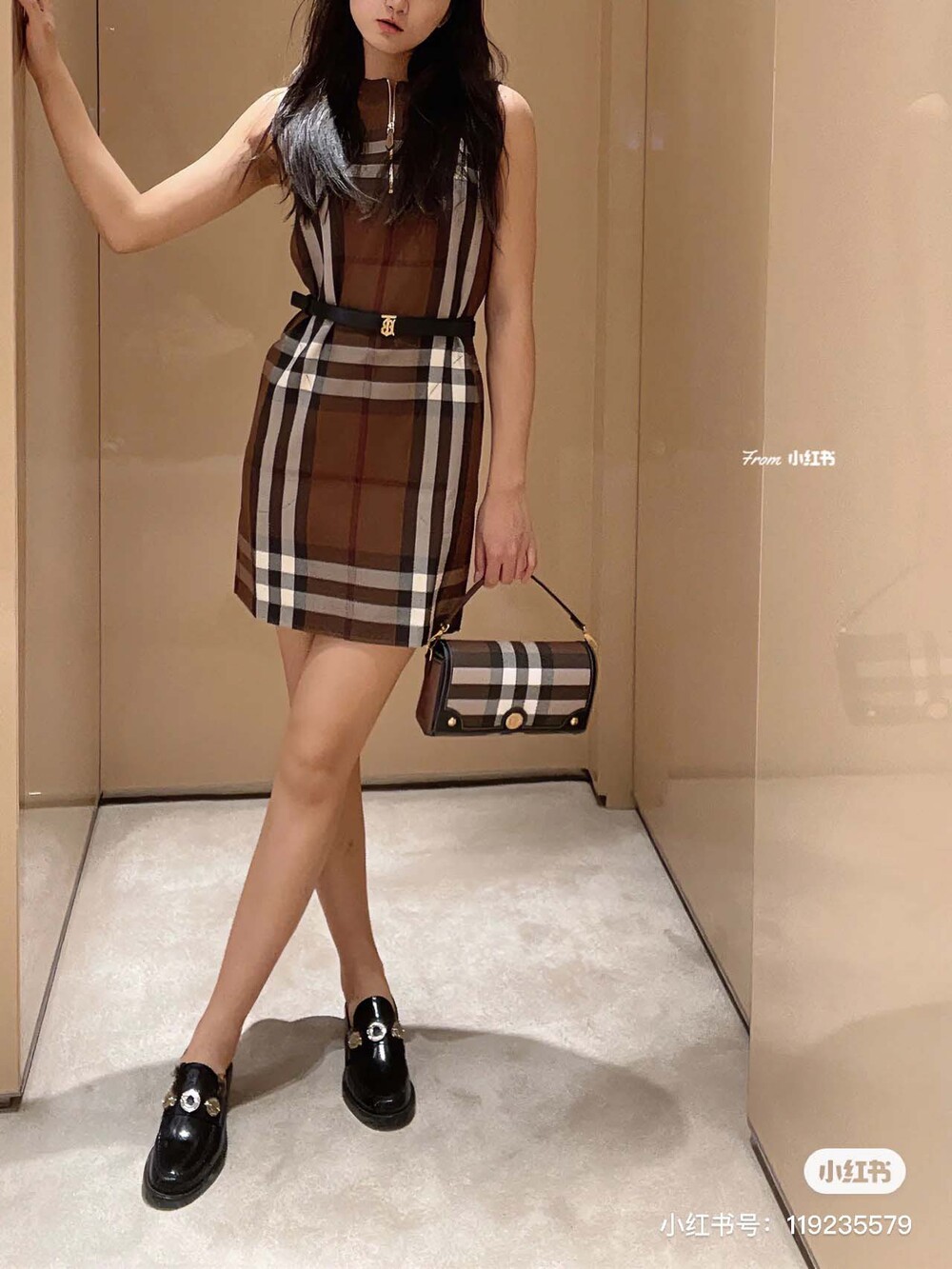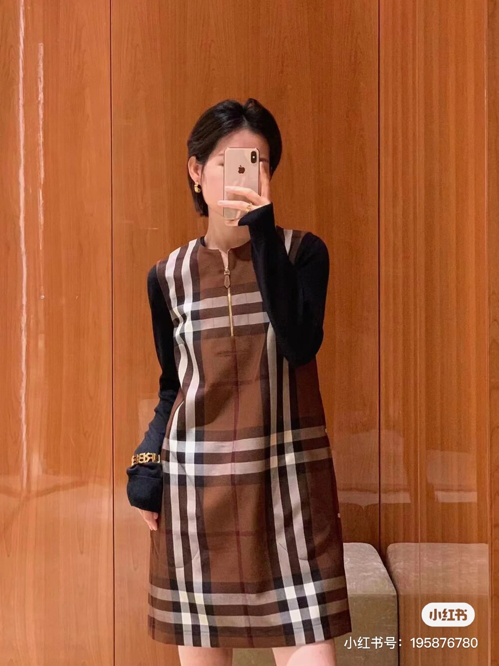 이 브라운 우드 체크 무늬 셔츠 드레스는