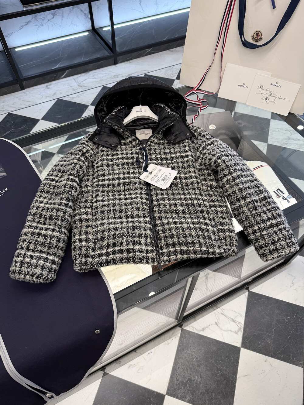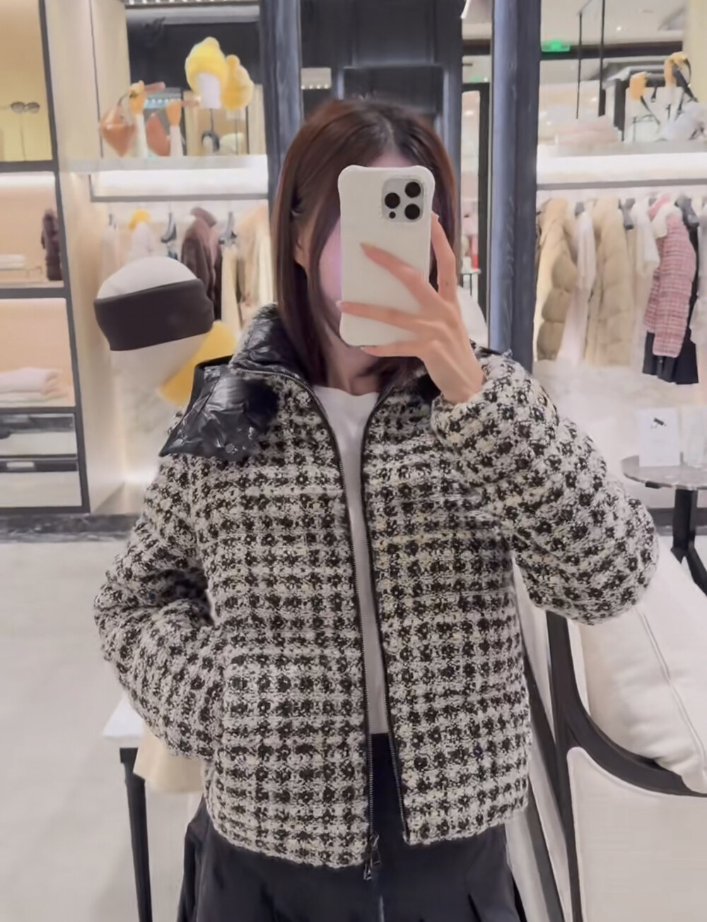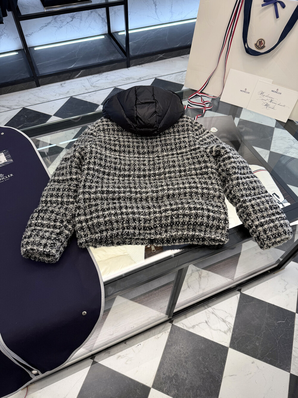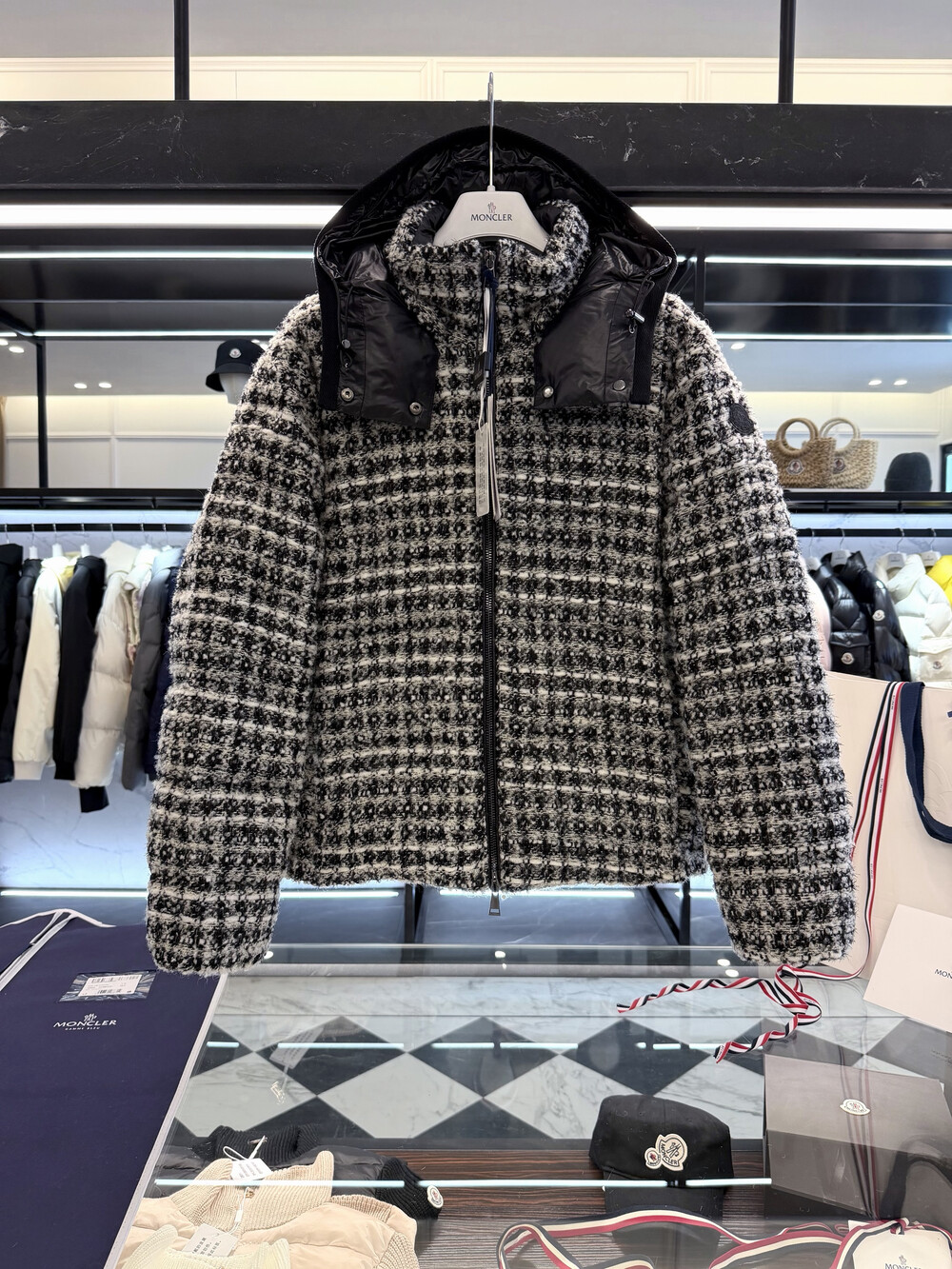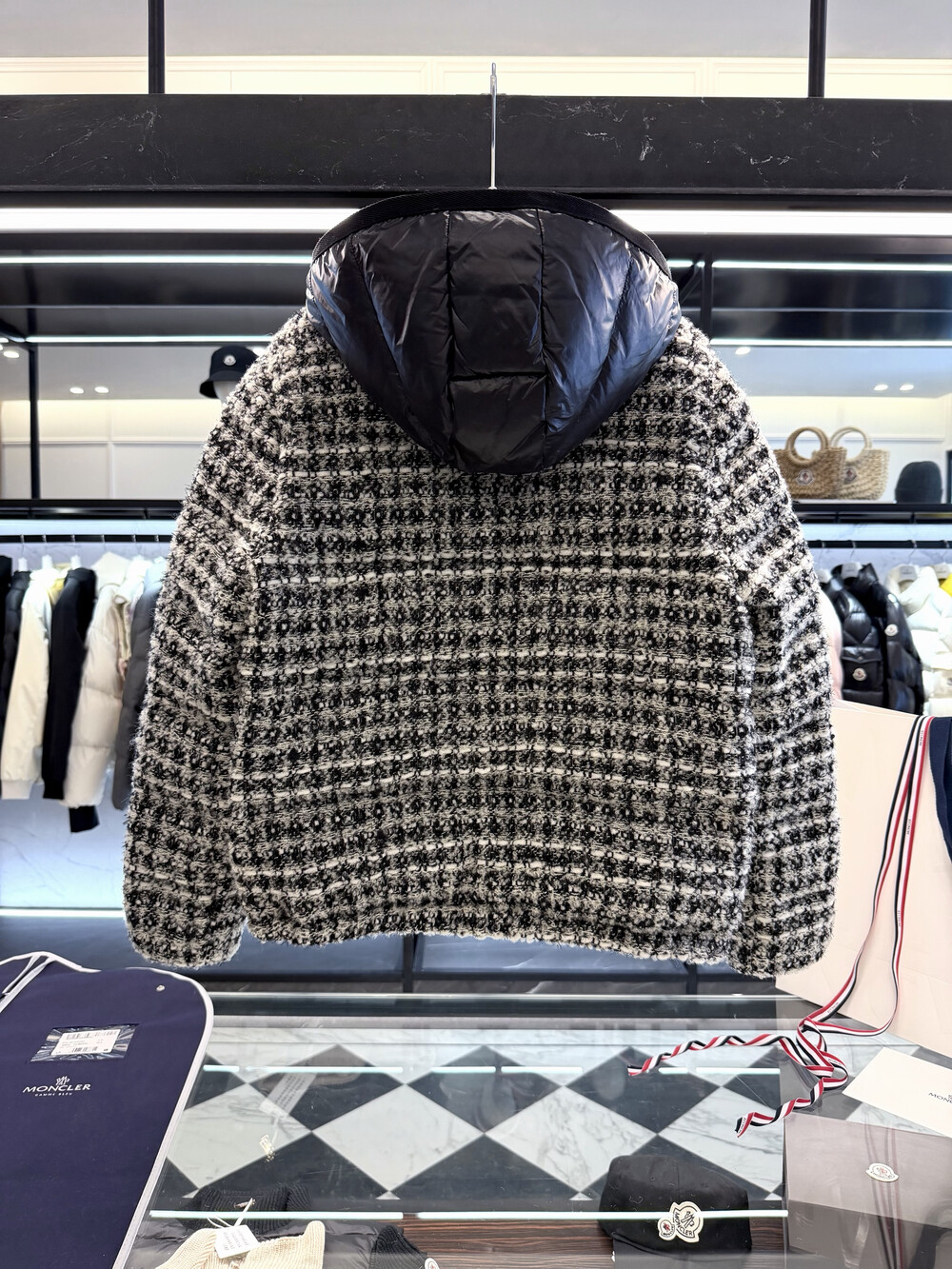 메탈릭 트위드 체크 패턴으로 제작되었습니다