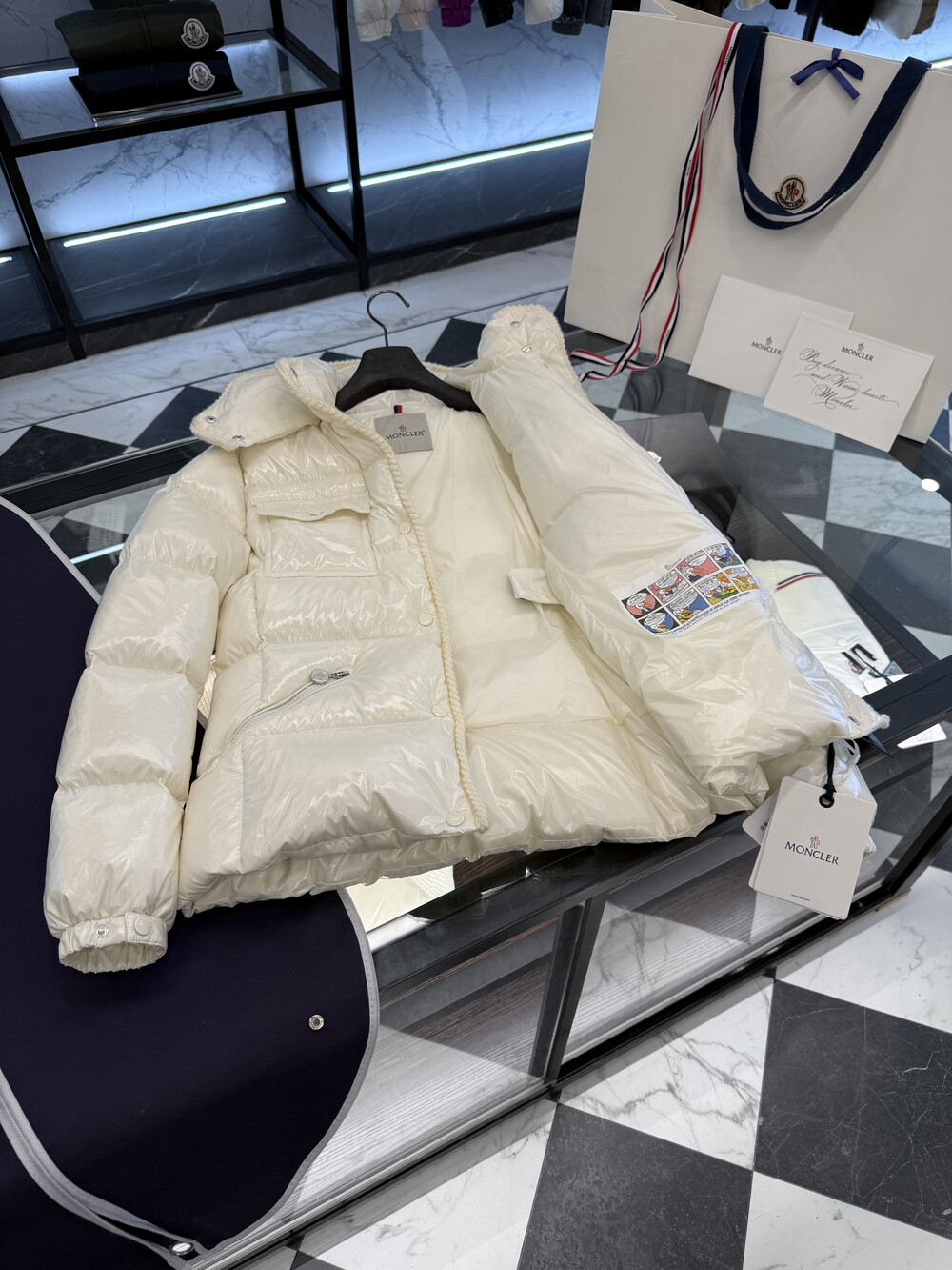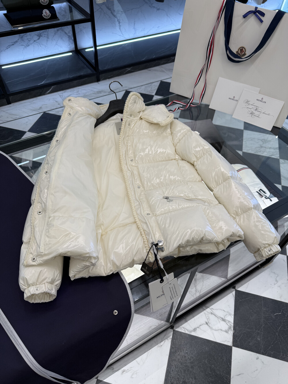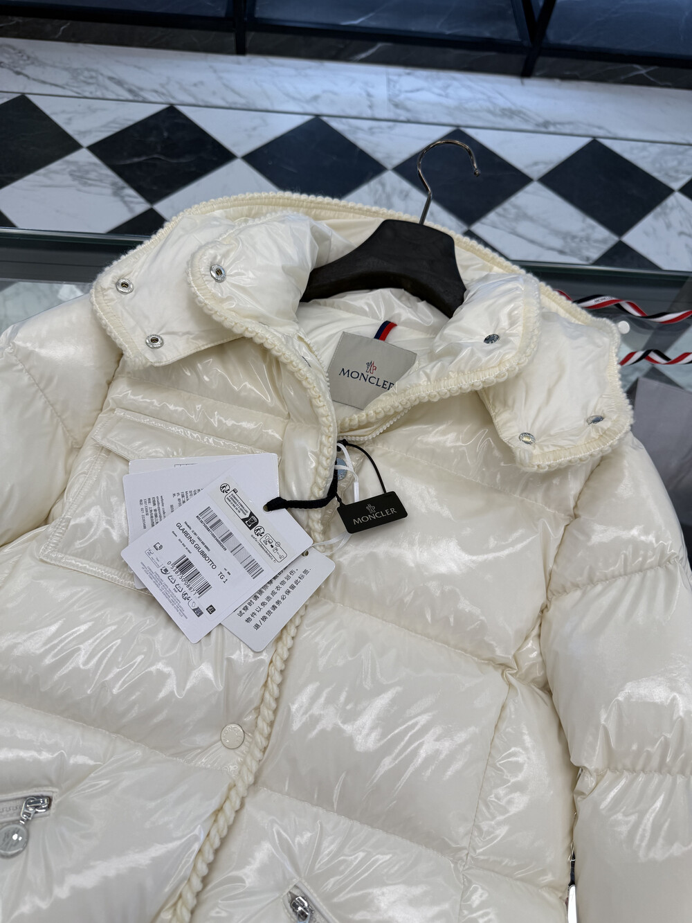 클래식 다운 재킷을 정교한 우븐 트리밍으로