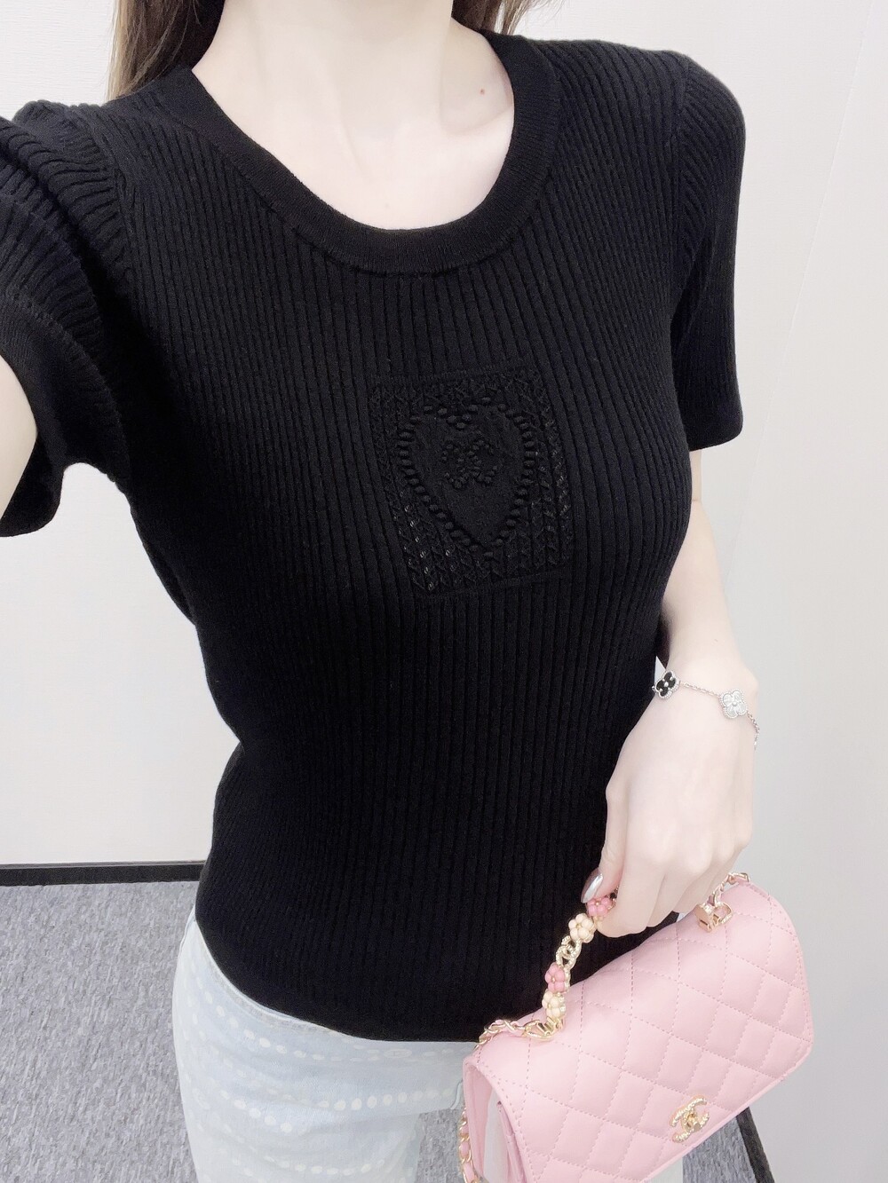 니트 반팔 티셔츠는 가슴 부분에