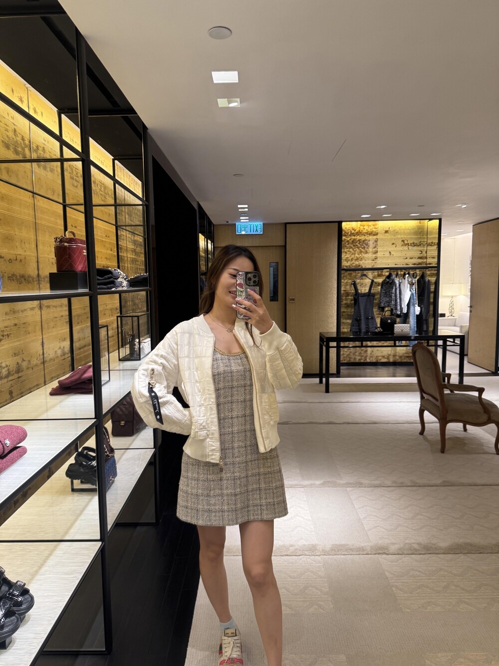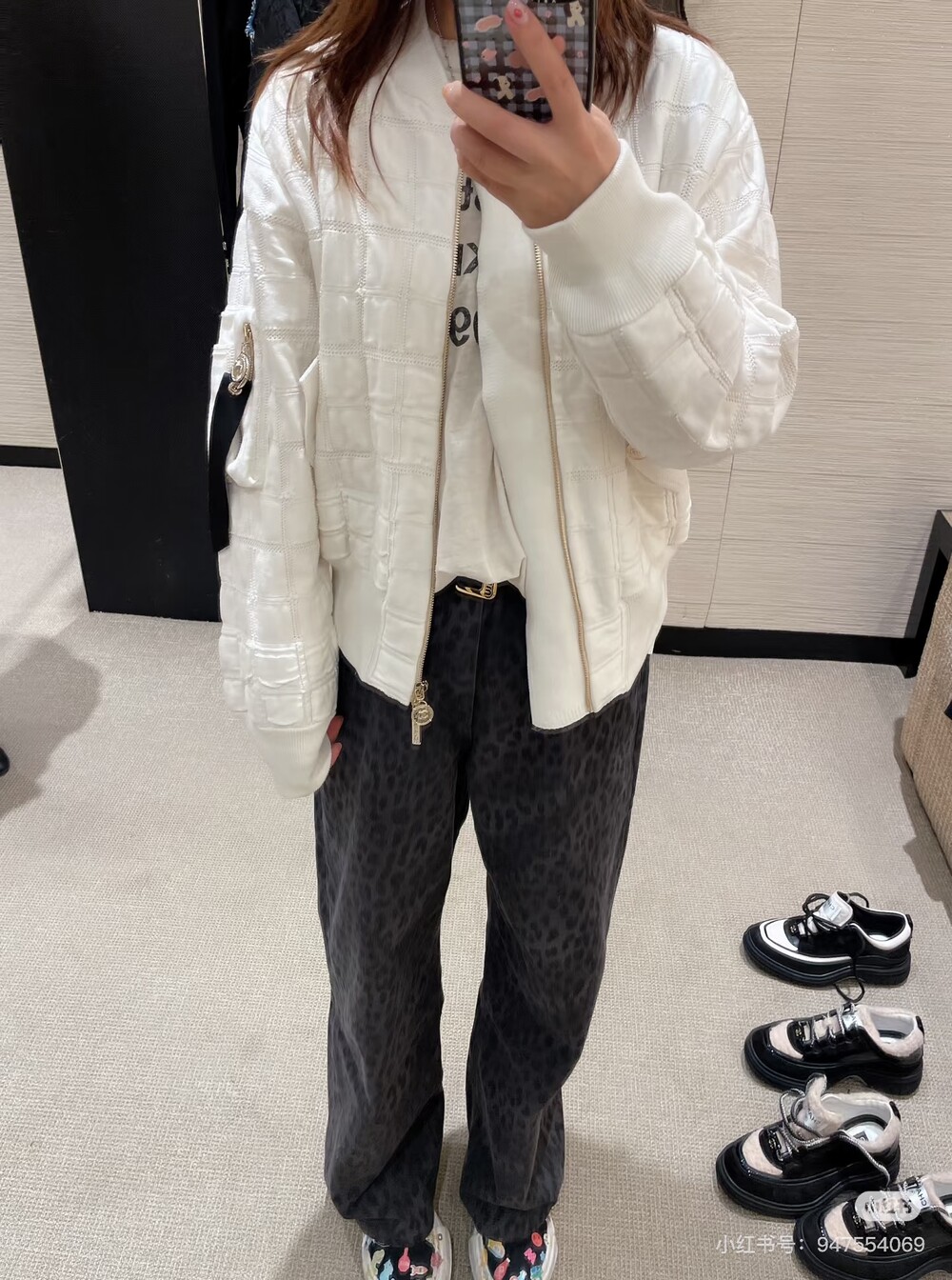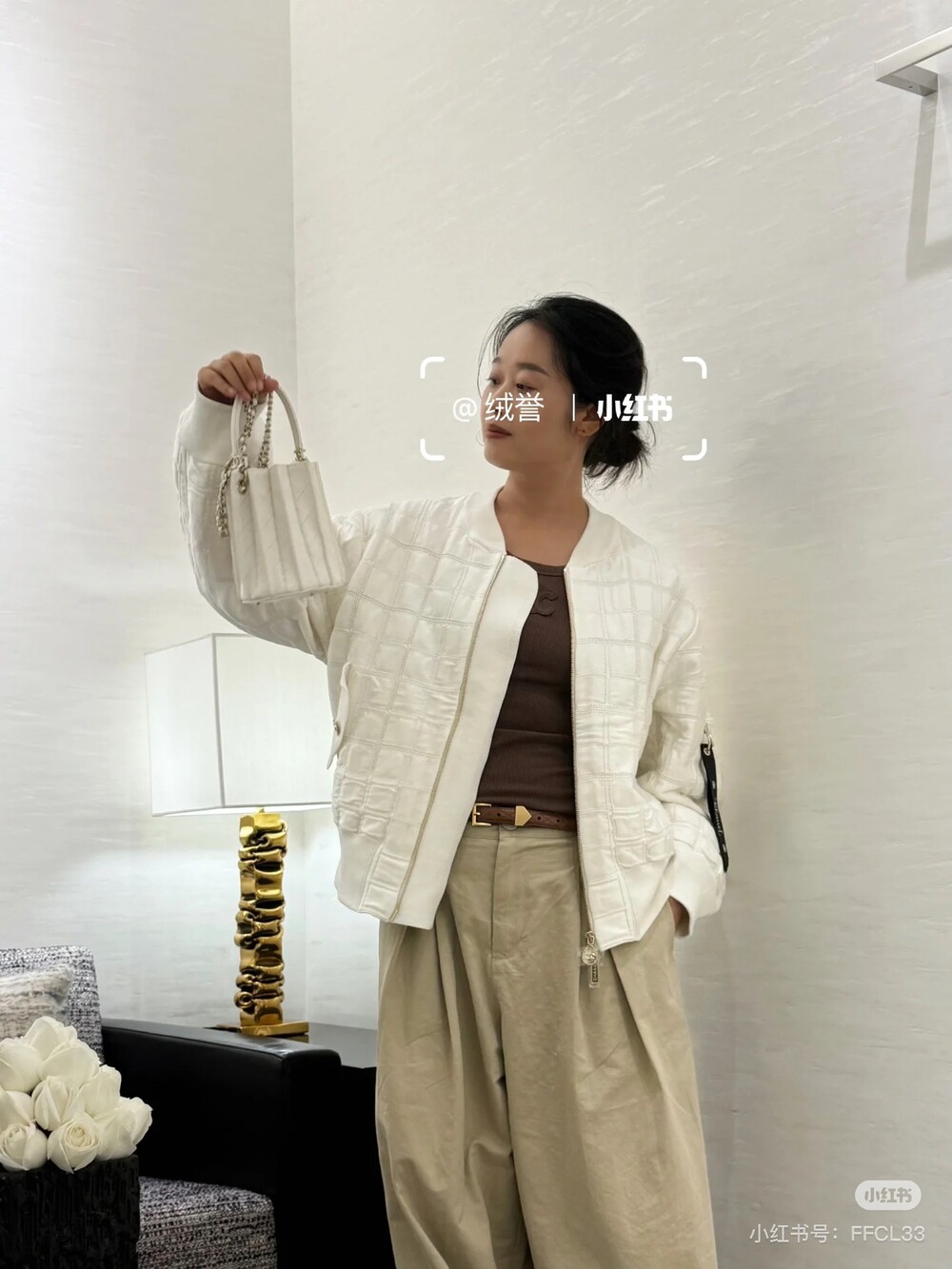 골드 지퍼와 메탈 버클이 은은하게 빛나고,