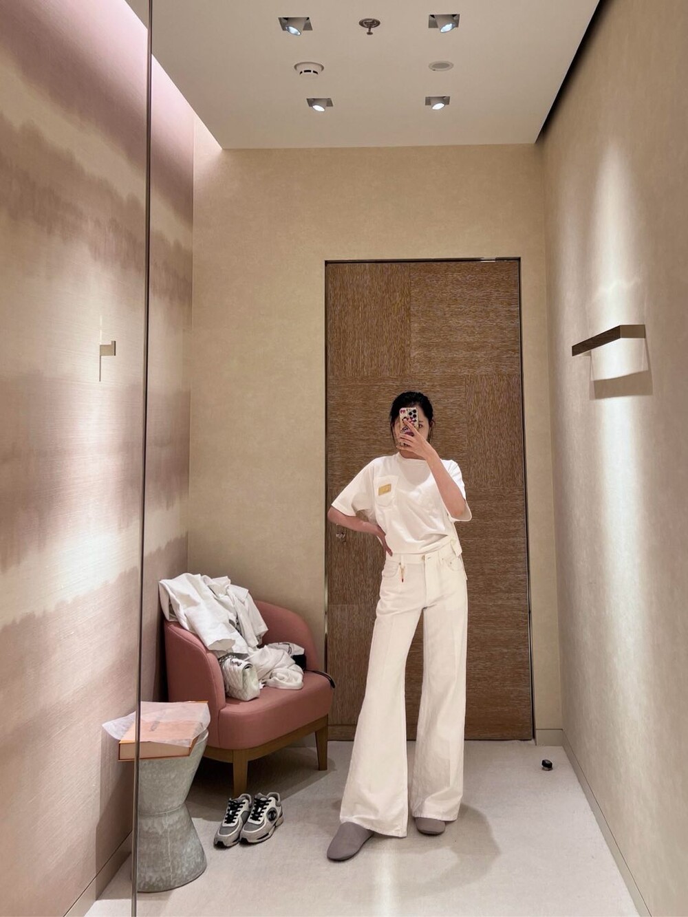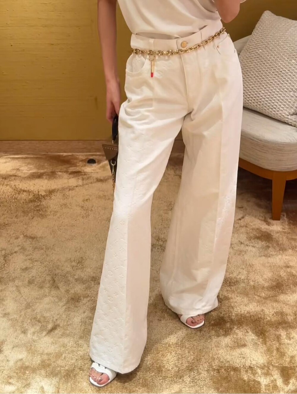 날렵한 하이웨이스트 패턴은 와이드 레그,