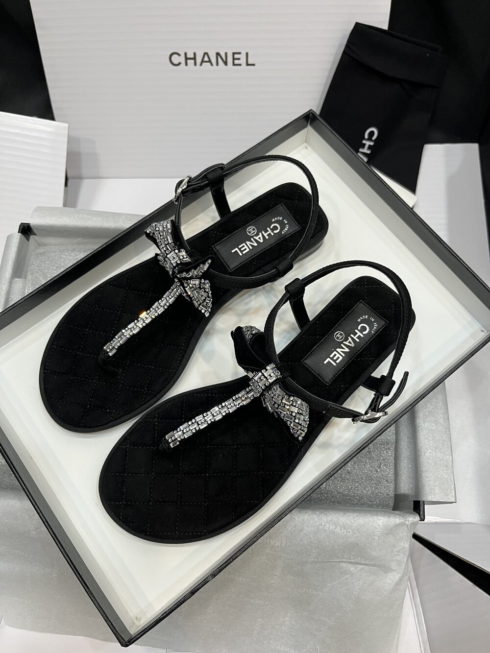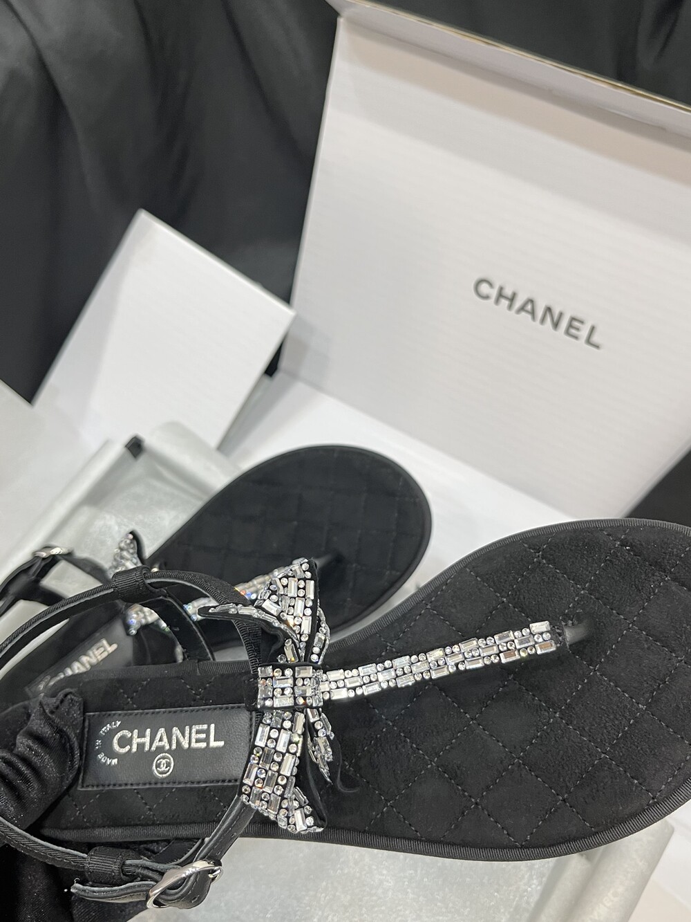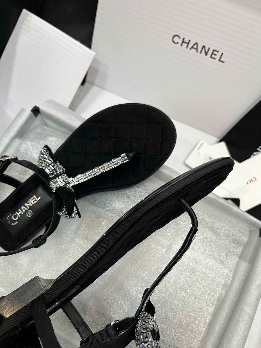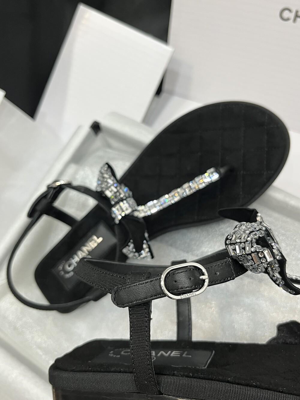 𝐂.𝐡𝐚𝐧𝐞𝐥 보우 크리스탈 버클 끈 샌들,