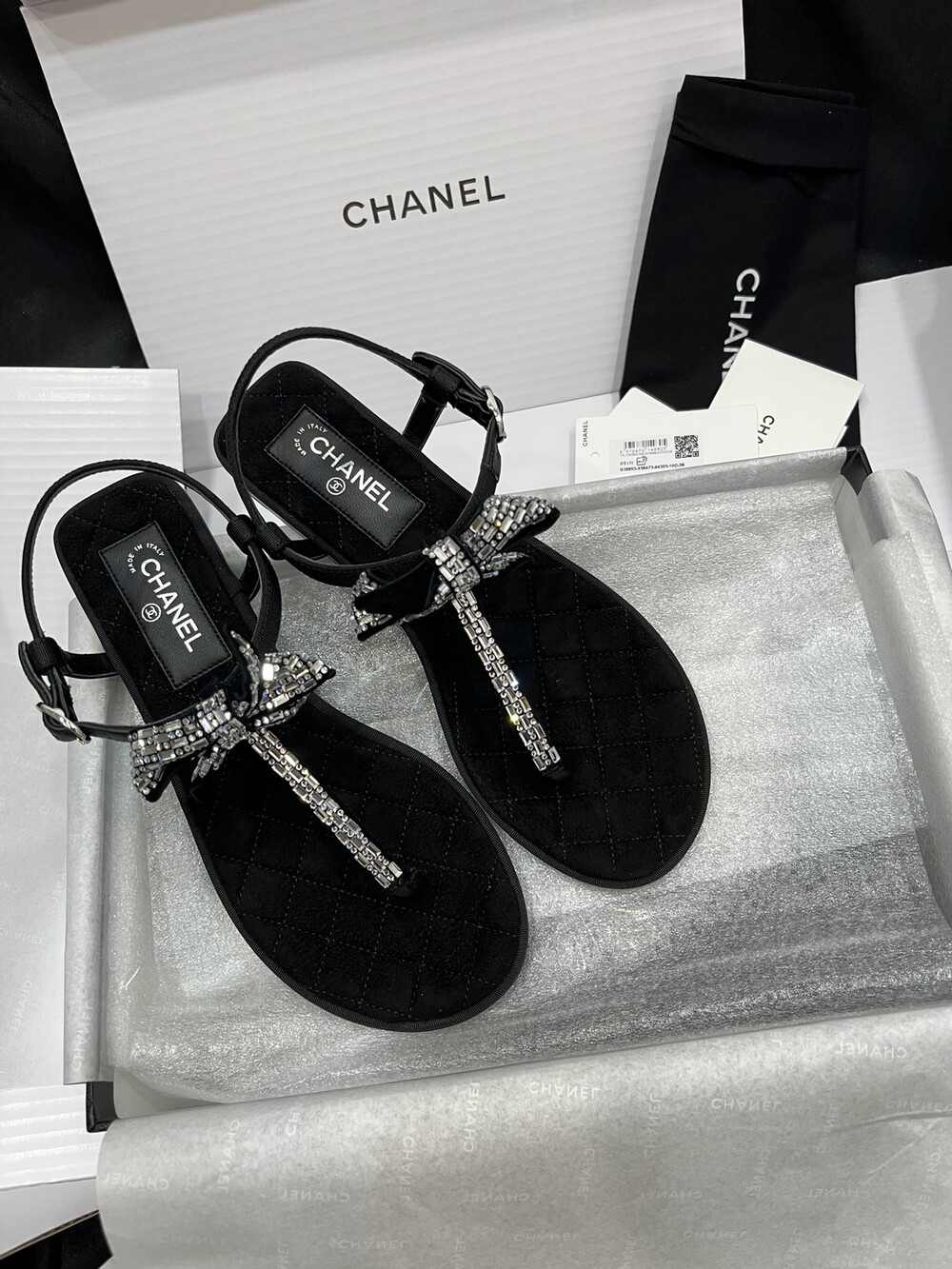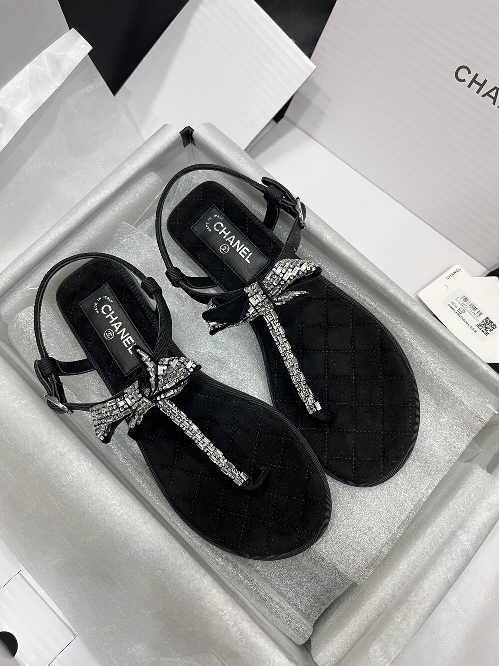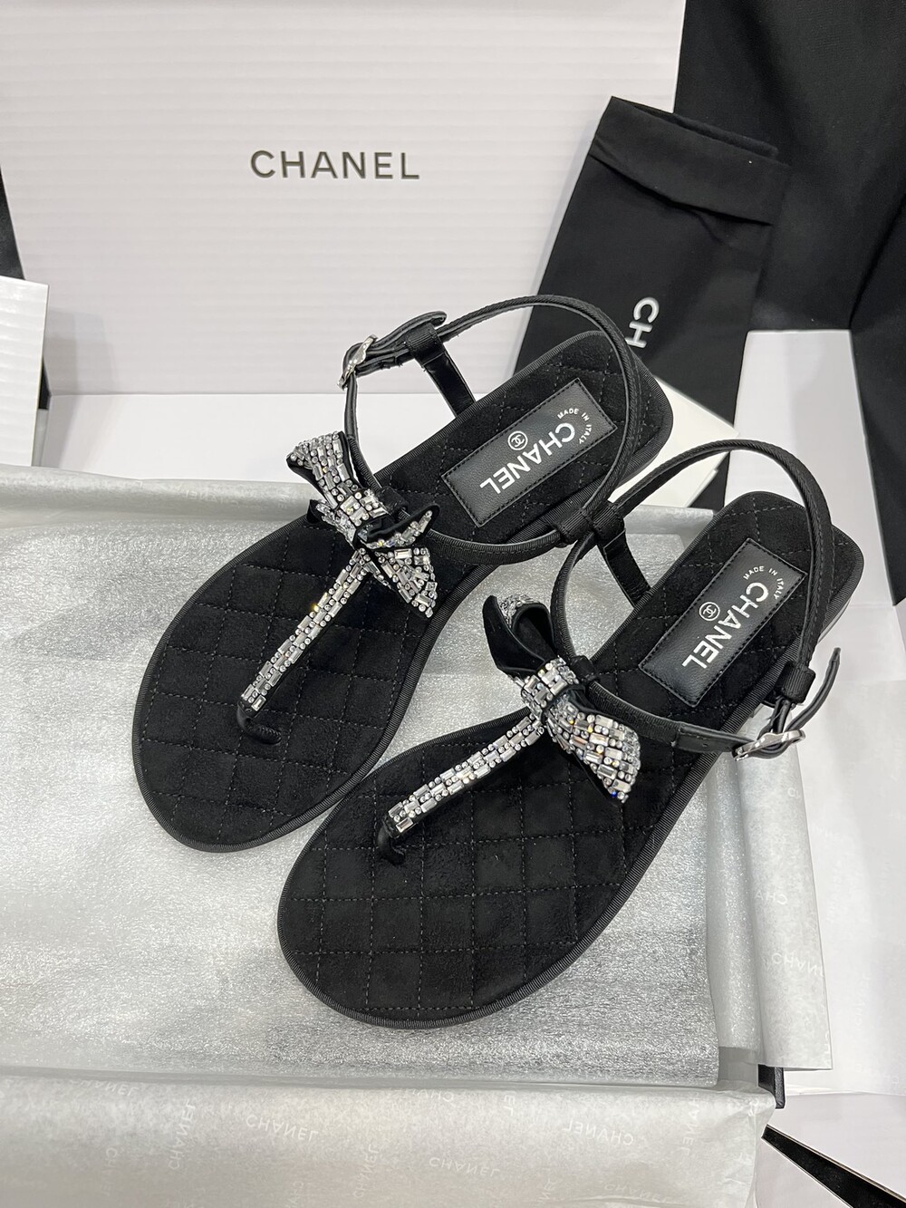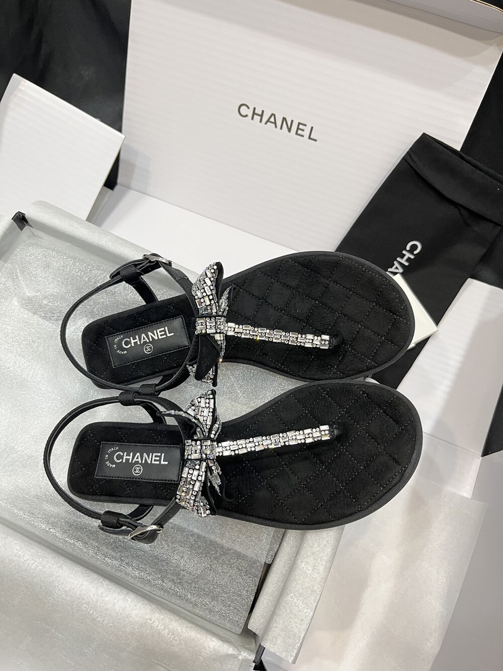 𝐂.𝐡𝐚𝐧𝐞𝐥 보우 크리스탈 버클 끈 샌들,