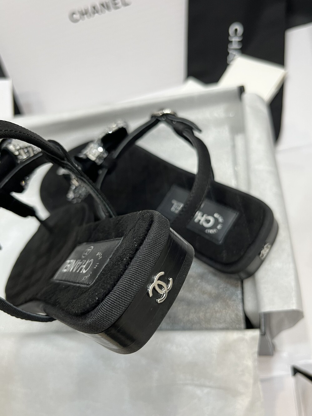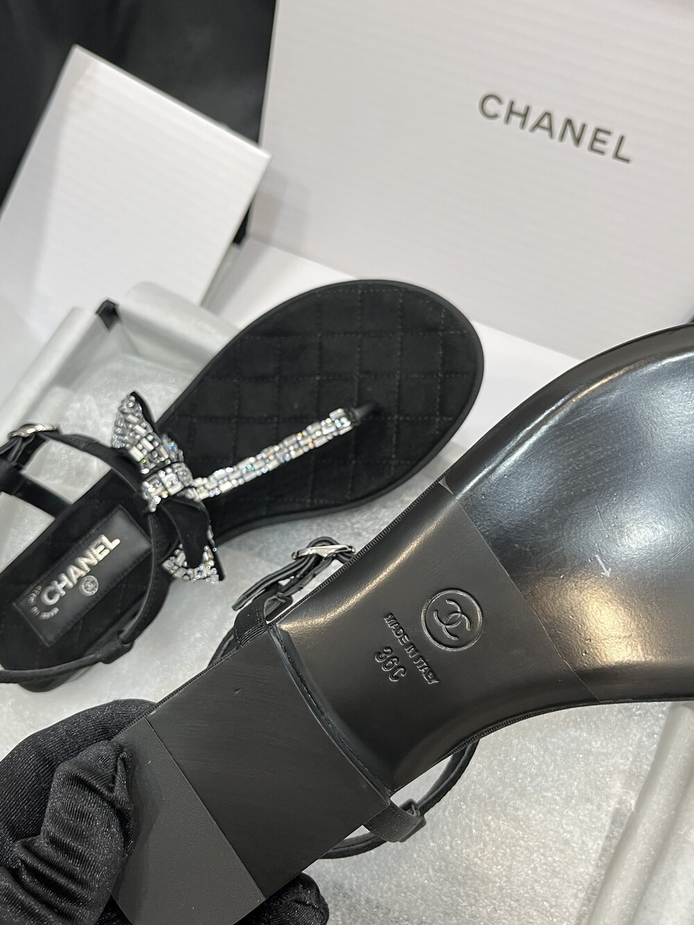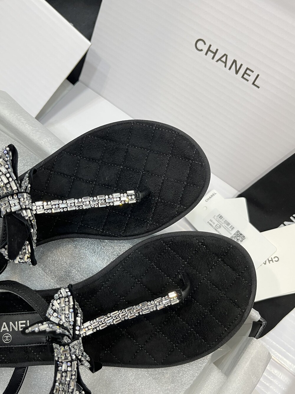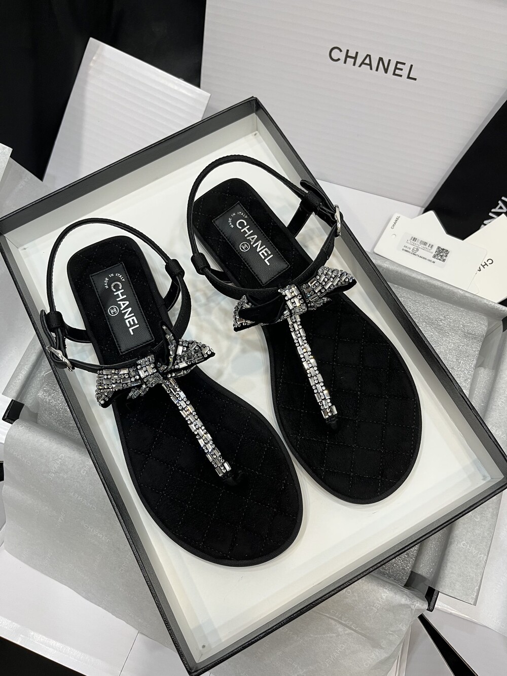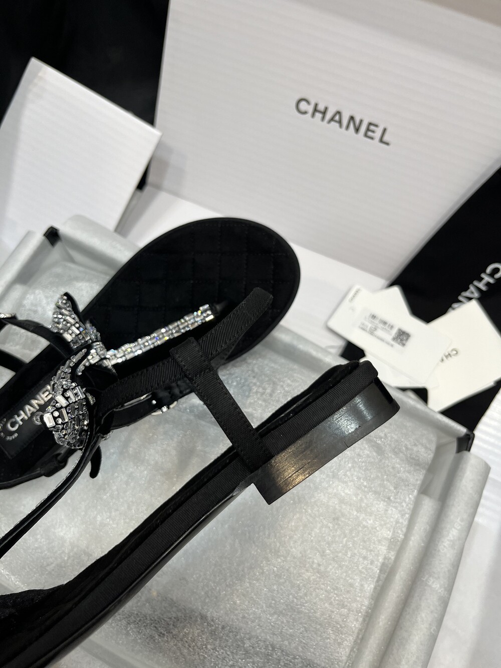 𝐂.𝐡𝐚𝐧𝐞𝐥 보우 크리스탈 버클 끈 샌들,