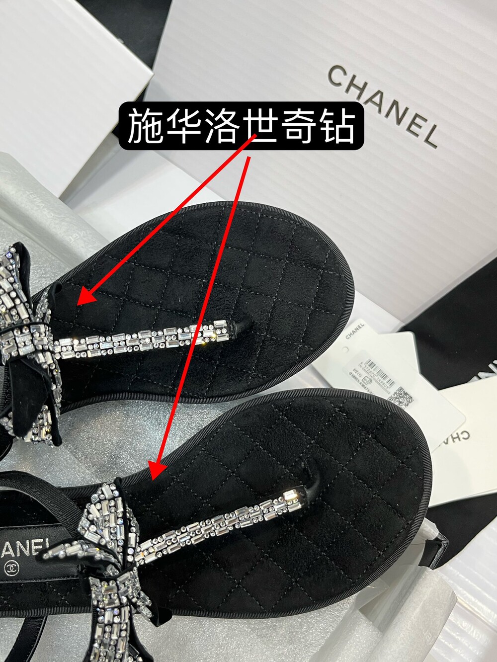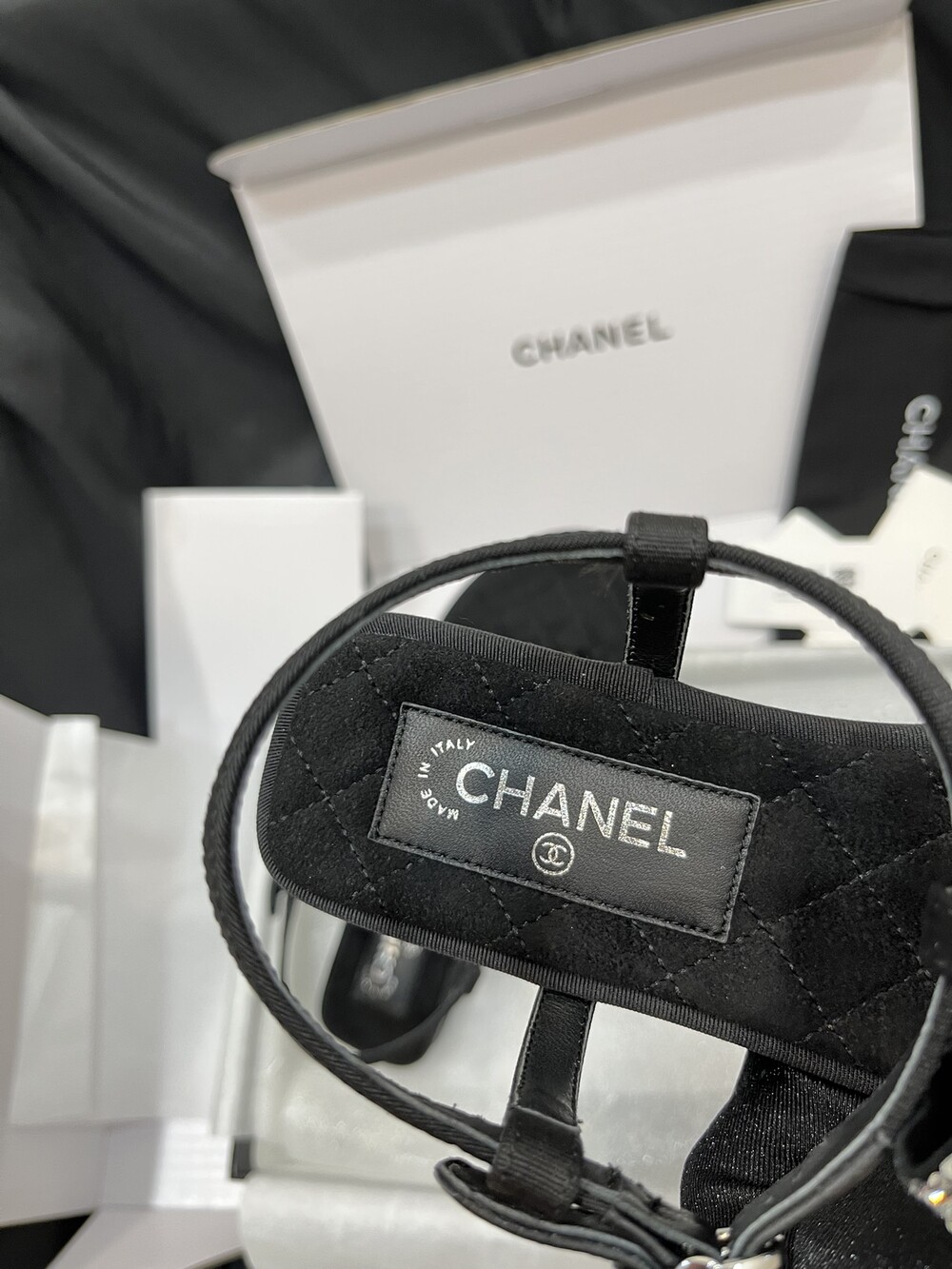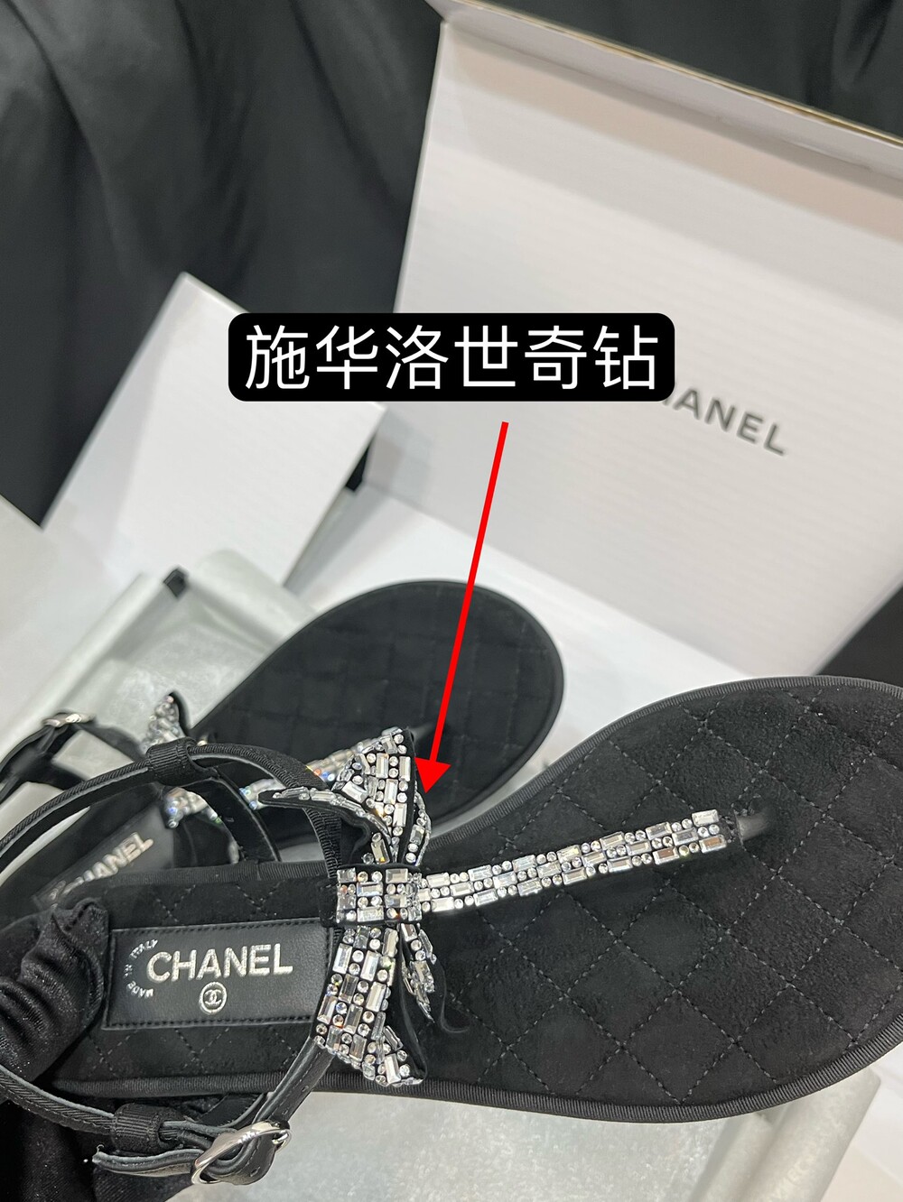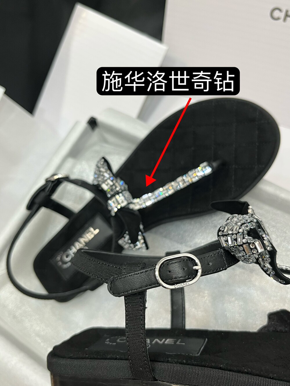 𝐂.𝐡𝐚𝐧𝐞𝐥 보우 크리스탈 버클 끈 샌들,