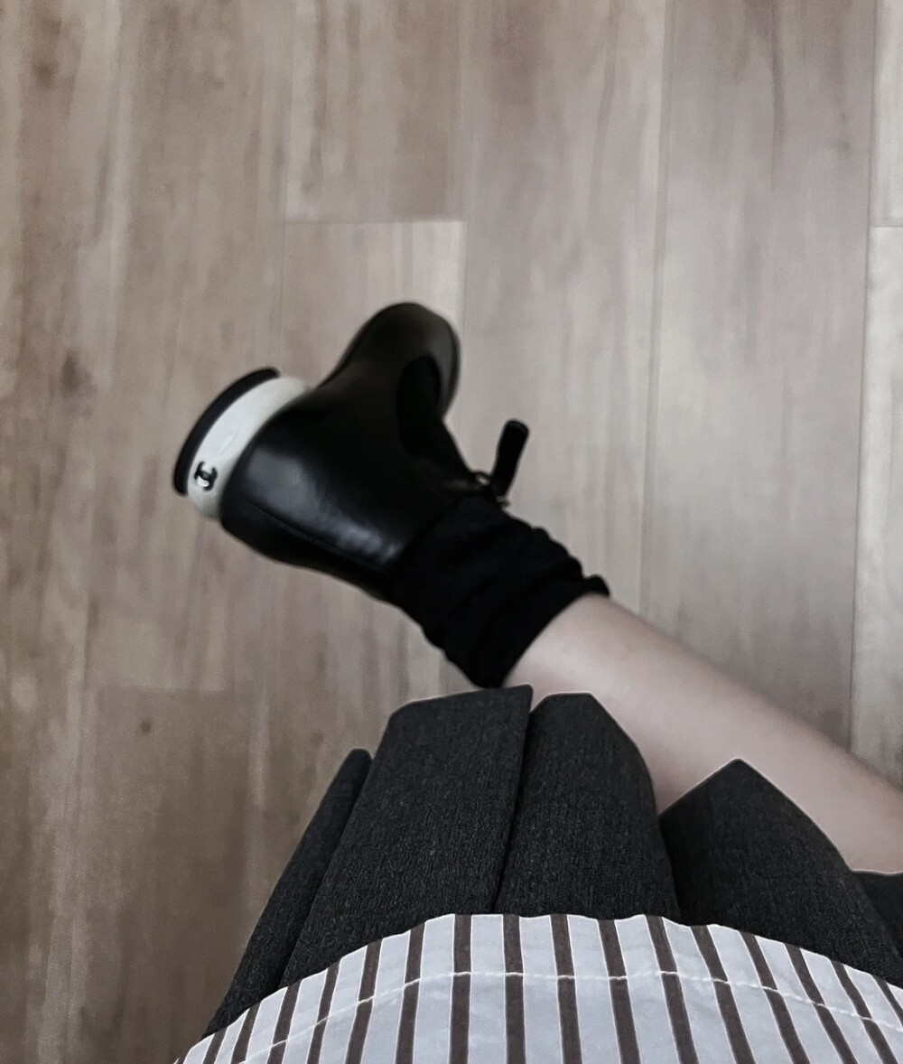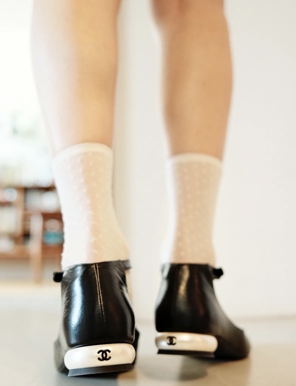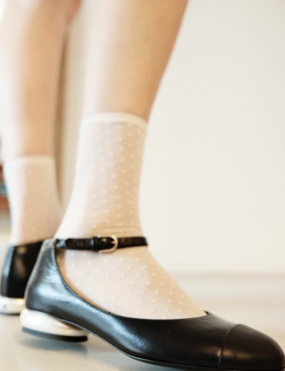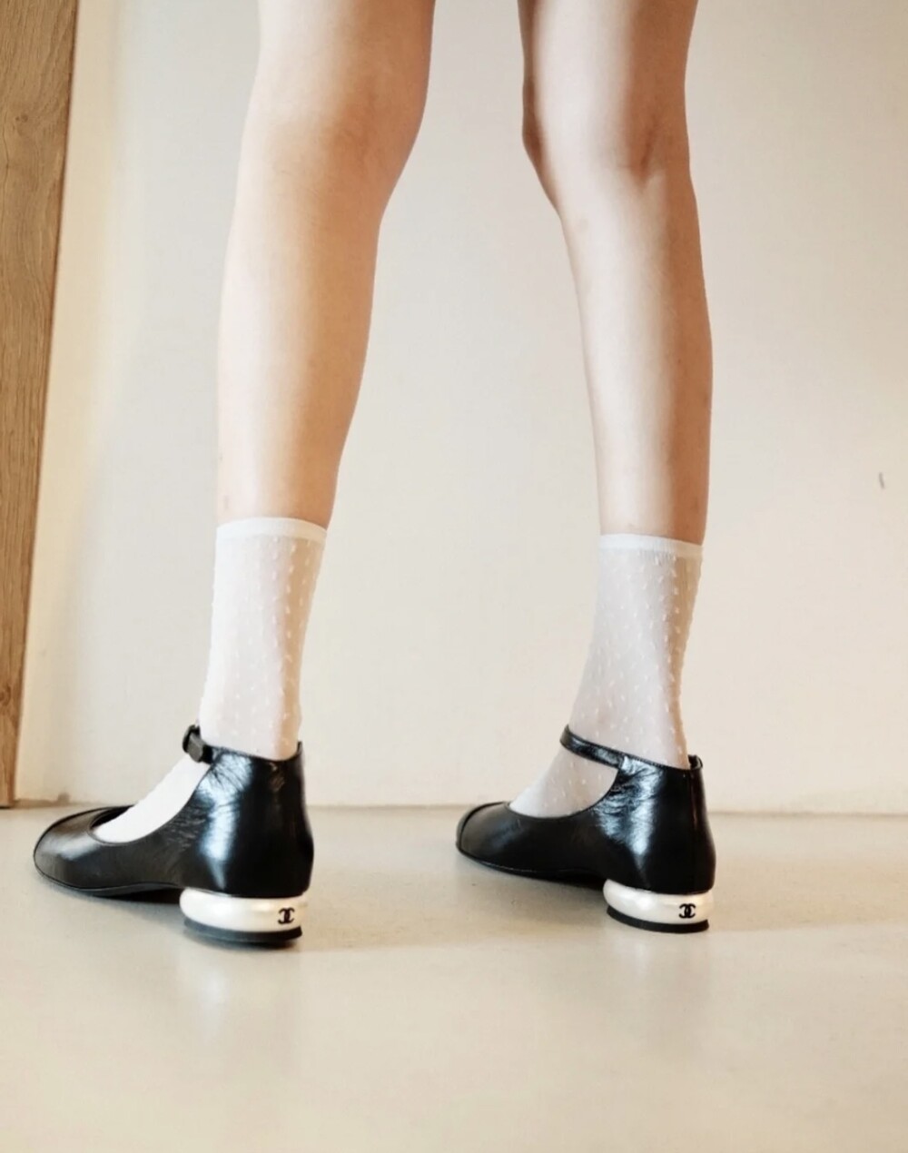 둥근 앞코에 진주 질감의 작은 로고를 매치하여