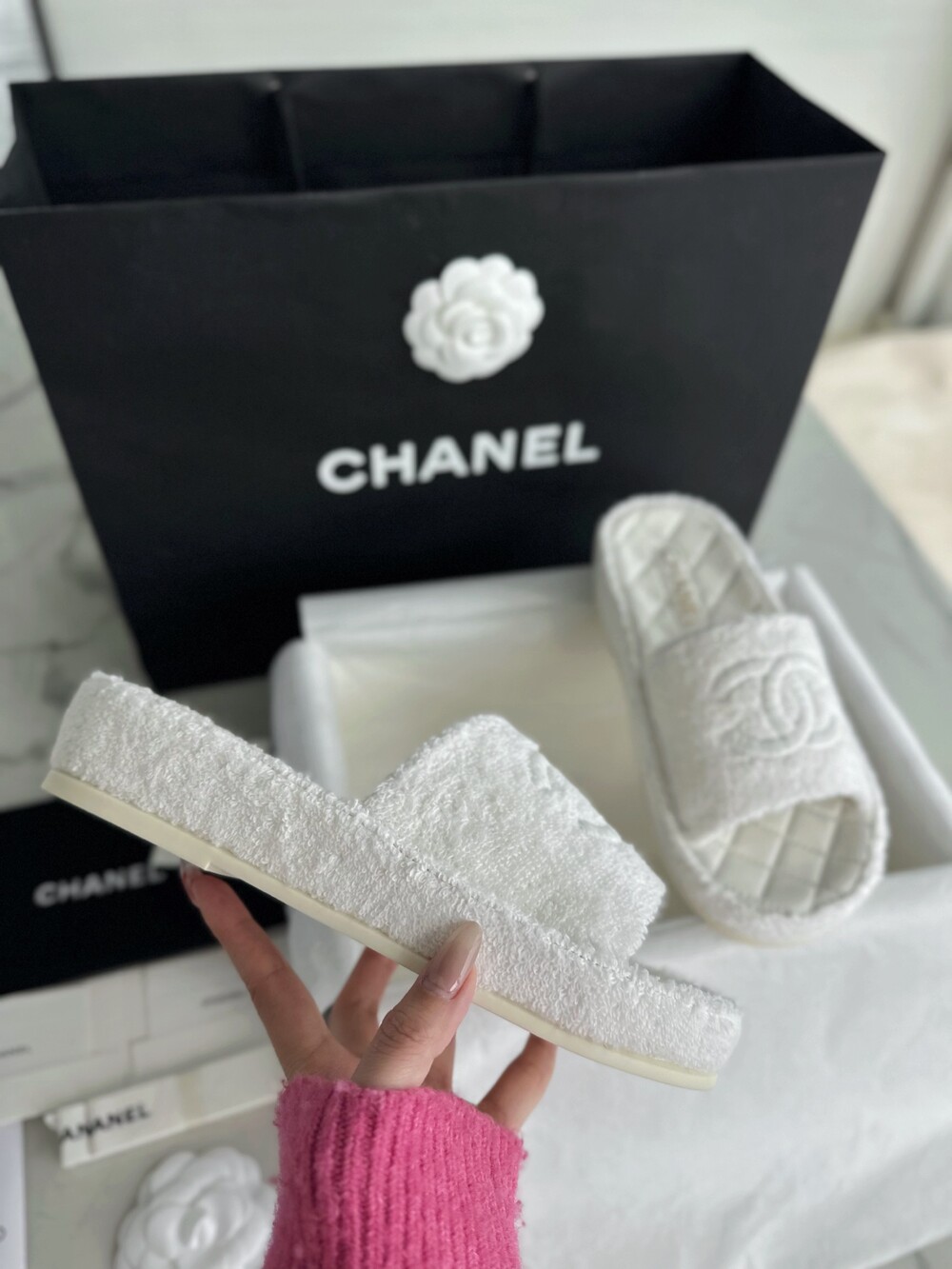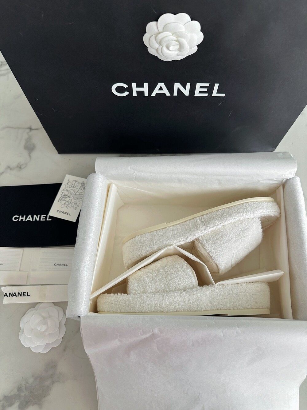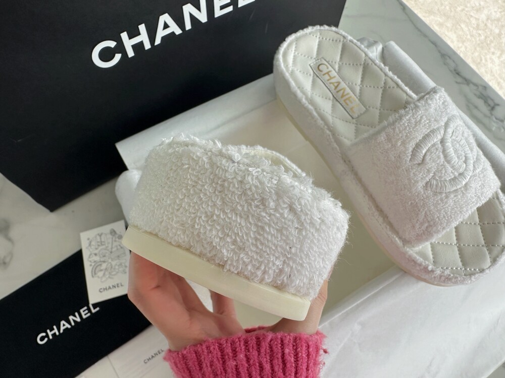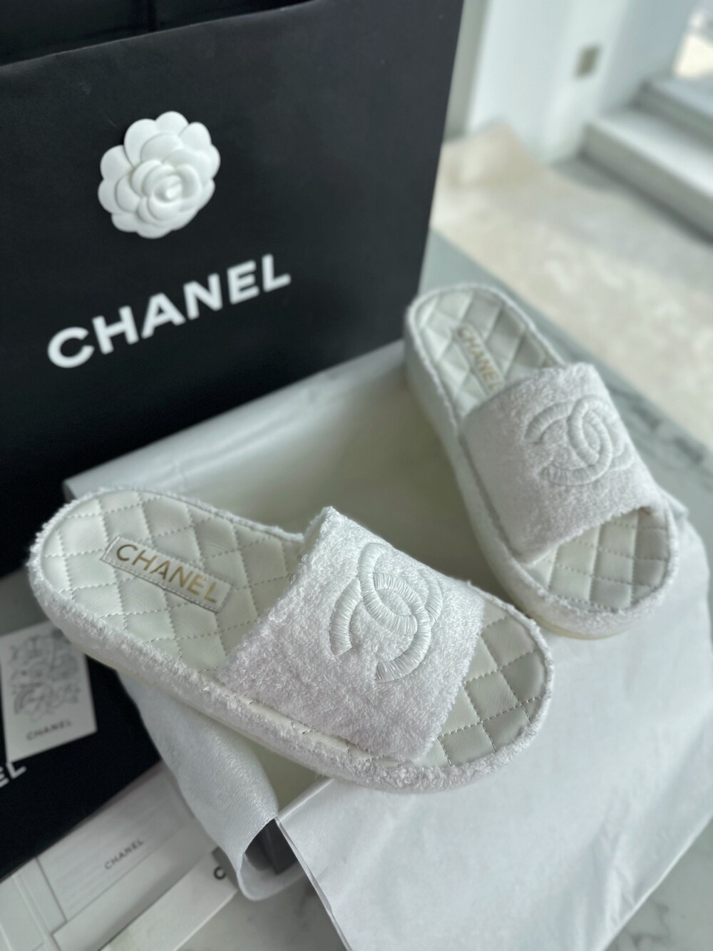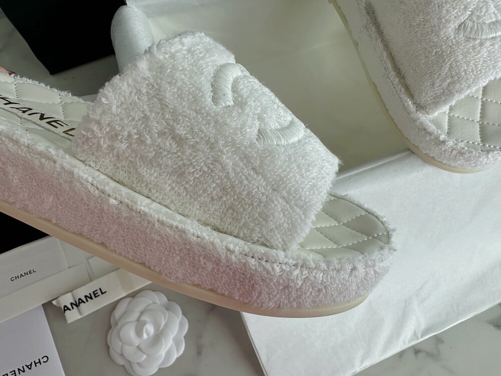 𝐂𝐡𝐚𝐧𝐞𝐥 화이트 테리 자수 플랫폼 슬리퍼