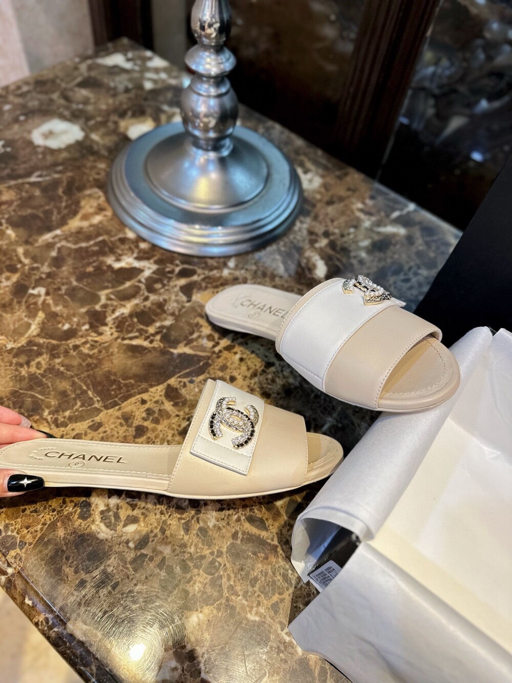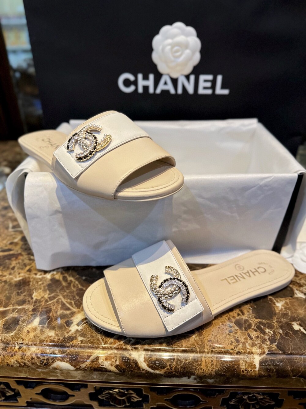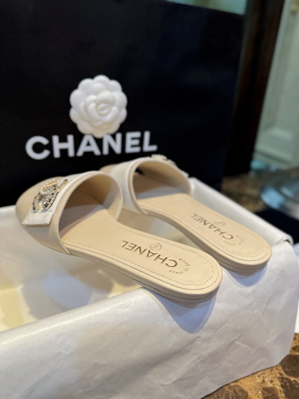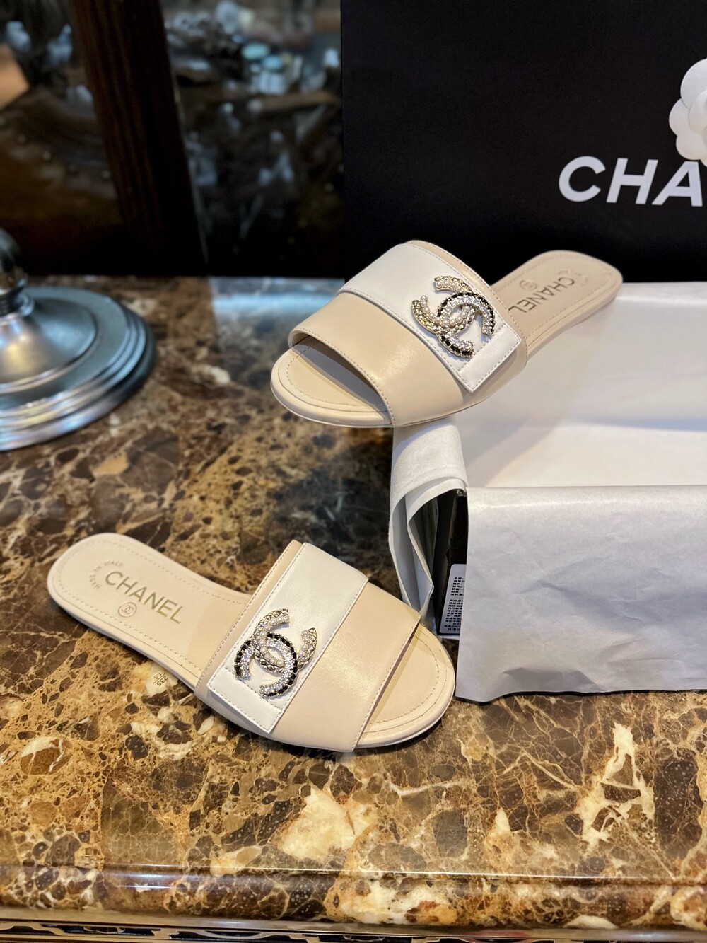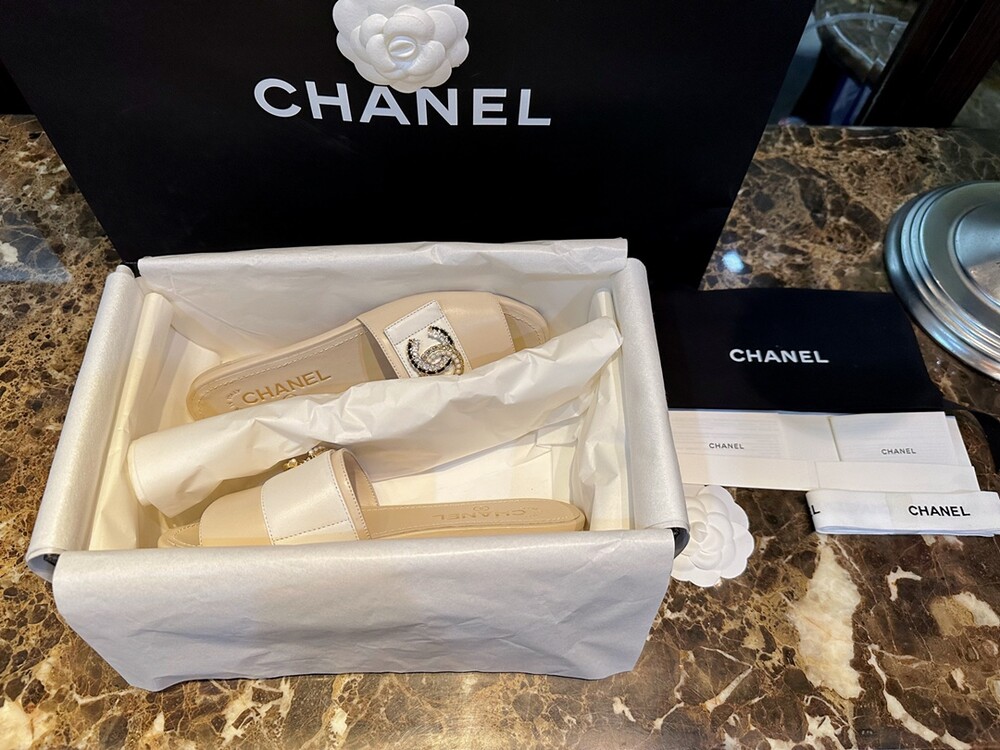 𝗖.𝗛𝗔𝗡𝗘𝗟 진주 큐빅 슬리퍼