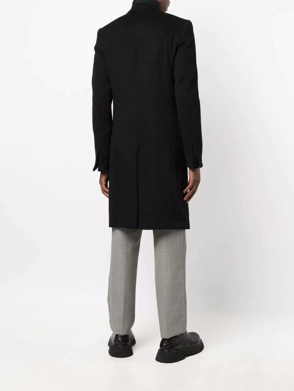 라펠의 3버튼 디자인과 뒷면 중앙 슬릿,