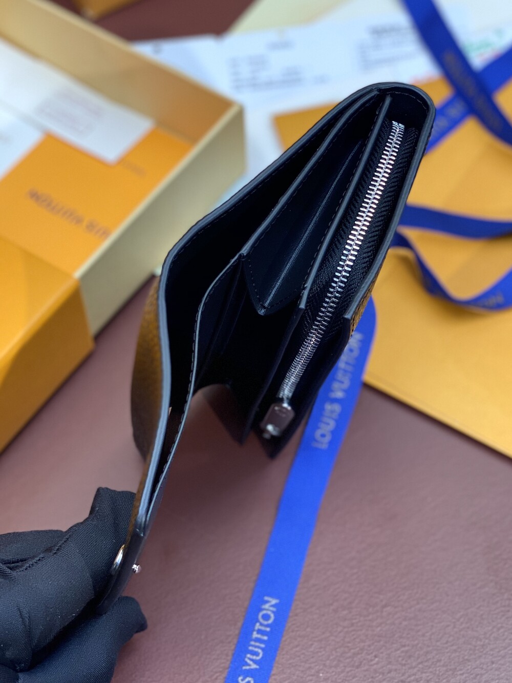 곡선형 플랩을 열면 신용카드 슬롯과 지퍼가 달린